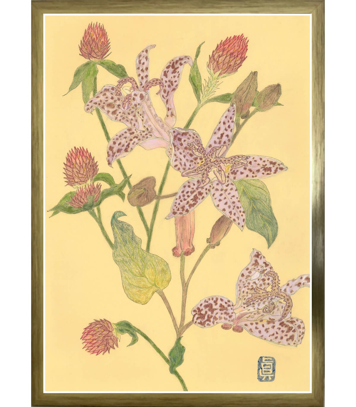 Masumi Omae was born in Kyoto, Japan, and lives in Paris. She studied art history at the École du Louvre. Later, she worked in Paris for 24 years as a designer of hats, leather goods, and scarves for a French brand. She began taking Ikebana classes at the École Ikénobô and has been drawing flowers since 2022. The intention behind her flower drawings is to integrate living flowers into our daily lives through Ikebana, floral arrangements, and gardening, which allows us to experience the ephemeral beauty of plant life throughout the seasons. Her drawings are born from this source of inspiration : the fragile and luminous beauty of these living beings. Through the composition on paper, the expression of the flowers, and the harmony of colors, she expresses her own emotions and sensitivity. Whether we are happy, sad, or simply experiencing an emotion, flowers and plants always seem ready to embrace our feelings with gentleness and silence. She hopes that her drawings, too, will offer those who look at them a moment of peace, light, and serenity.