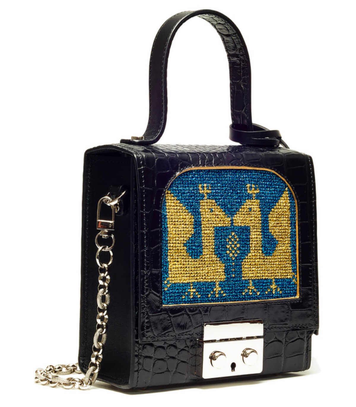 • Information : handbag in two full-grain calfskin leathers : hand-embossed crocodile calfskin and Box Calf calfskin. Hand-embroidered with metallic threads, gold bird motif on a blue background. Inner edges of the flap frame smoothed with a net and dyed gold. Clasp and components in palladium-plated brass and zamak. Choice of a removable and adjustable Box Calf calfskin shoulder strap or a removable, non-adjustable palladium-plated brass chain shoulder strap. Both can be added ; the price varies accordingly. Black-dyed edges