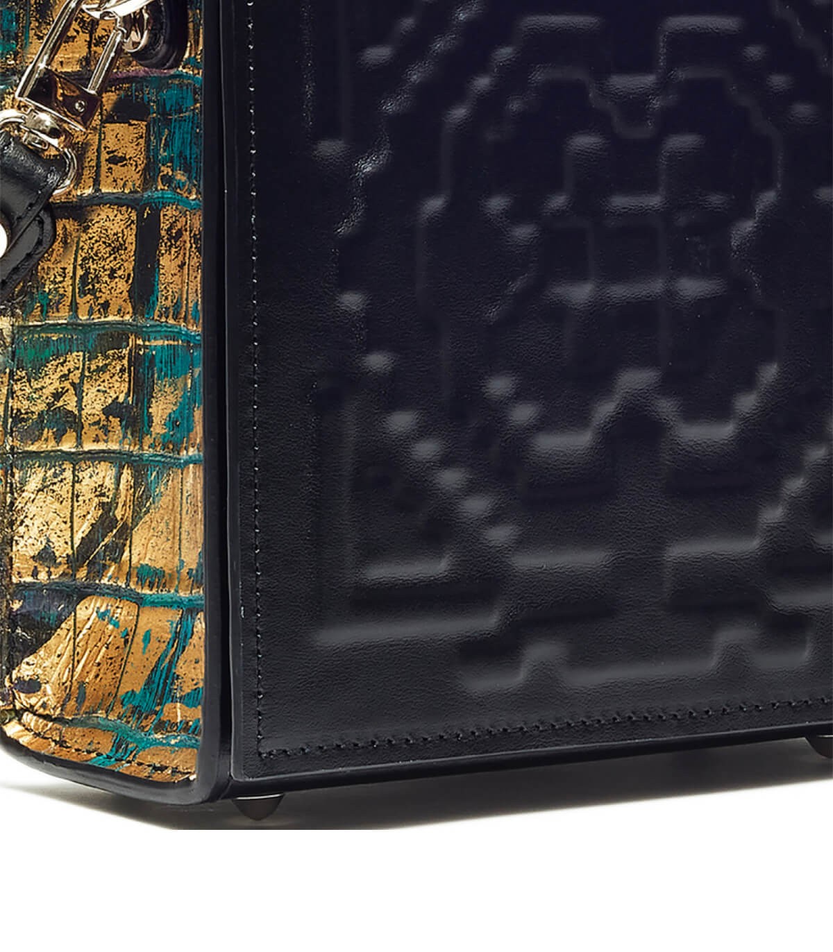 EXTERIOR : 100% full-grain calfskin leather. Smooth and supple black Box Calf leather. Rigid calfskin leather with hand-embossed crocodile pattern, embellished using an authentic, artistic, and artisanal technique developed by the brand, then treated against UV rays and wear. Silver-colored metal components in brass and zamak coated with palladium and then treated with the cataphoresis technique, making them highly resistant to oxidation and wear over time. A shoulder strap is included in the price of the bag. Choose between the Box Calf leather shoulder strap (removable and adjustable) with its palladium-plated brass and zamak metal components OR the leather shoulder strap with its non-adjustable palladium-plated brass chain. It is possible to add both ; the price varies depending on the choice. Box Calf leather key ring with embossed logo