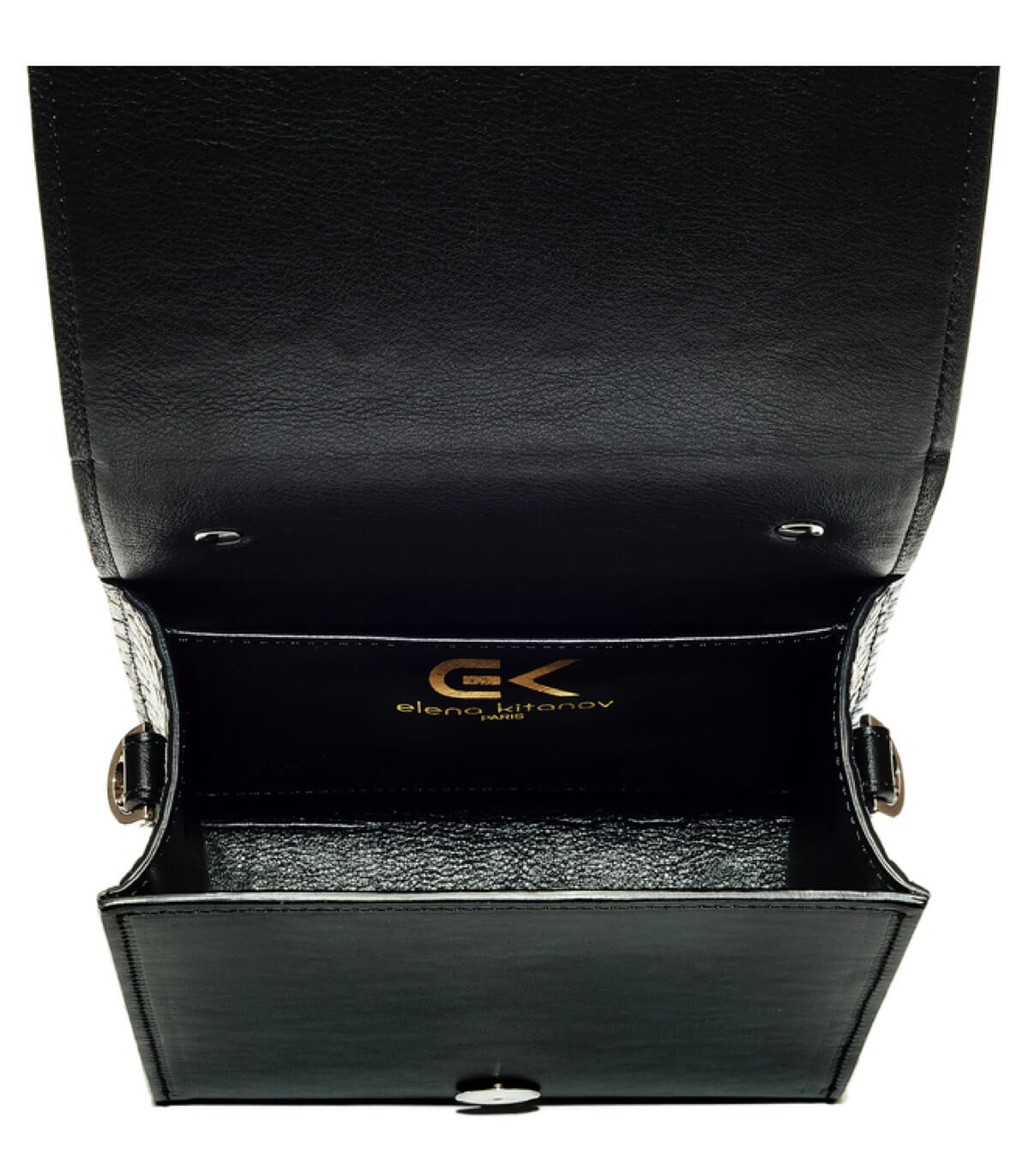EXTERIOR : 100% full-grain calfskin leather. Smooth and supple black Box Calf leather. Rigid calfskin leather with hand-embossed crocodile pattern, embellished using an authentic, artistic, and artisanal technique developed by the brand, then treated against UV rays and wear. Silver-colored metal components in brass and zamak coated with palladium and then treated with the cataphoresis technique, making them highly resistant to oxidation and wear over time. A shoulder strap is included in the price of the bag. Choose between the Box Calf leather shoulder strap (removable and adjustable) with its palladium-plated brass and zamak metal components OR the leather shoulder strap with its non-adjustable palladium-plated brass chain. It is possible to add both ; the price varies depending on the choice. Box Calf leather key ring with embossed logo