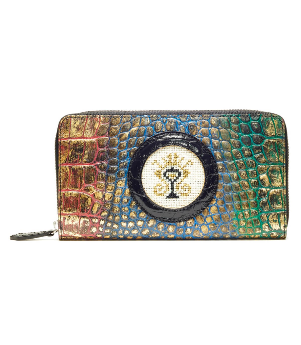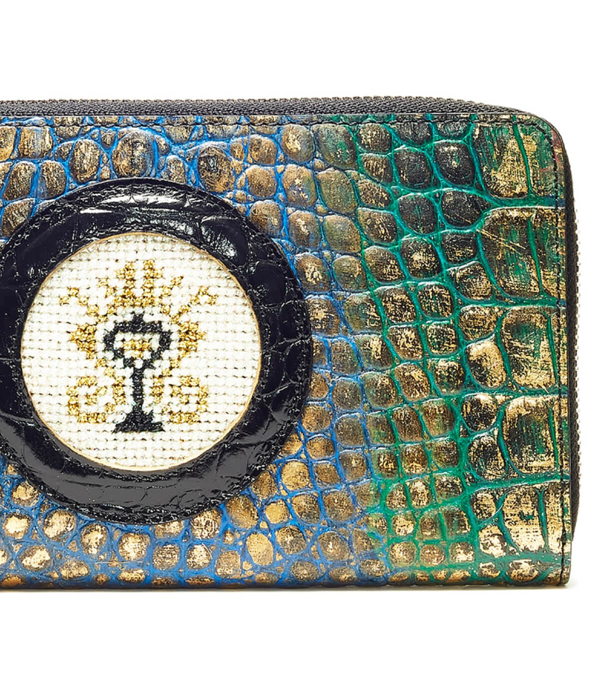 • Information : a "Companion" style wallet in hand-embossed, full-grain calfskin leather with a crocodile-embossed pattern, embellished with an authentic artistic technique of the brand - the manual application of artistic effects through coloring, waxing, and metallization. Adorned with a hand-embroidered crown motif using metallic threads. The frame is made of hand-embossed, full-grain calfskin leather in a crocodile-embossed pattern, with a gold-colored inner edge dye. The photo is for illustrative purposes only, as each hide is unique, making each piece one of a kind