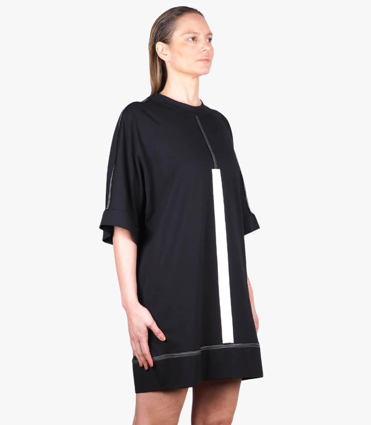 Information : STRIPE DOWN kimono t-shirt. This is a basic below the hip loose fit kimono top. It features a frontal and back vinyl print, crew neck and stitching details in sleeve and body hems. This garment is made out of mediumweight GOTS certified organic cotton jersey