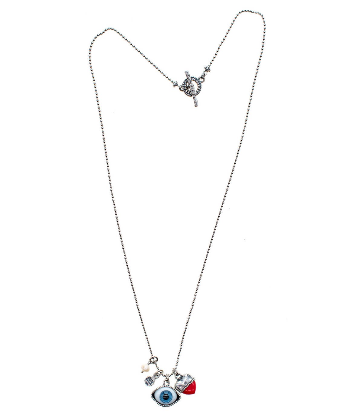 • Composition : argent massif, œil en verre peint à la main, corail reconstitué, perle