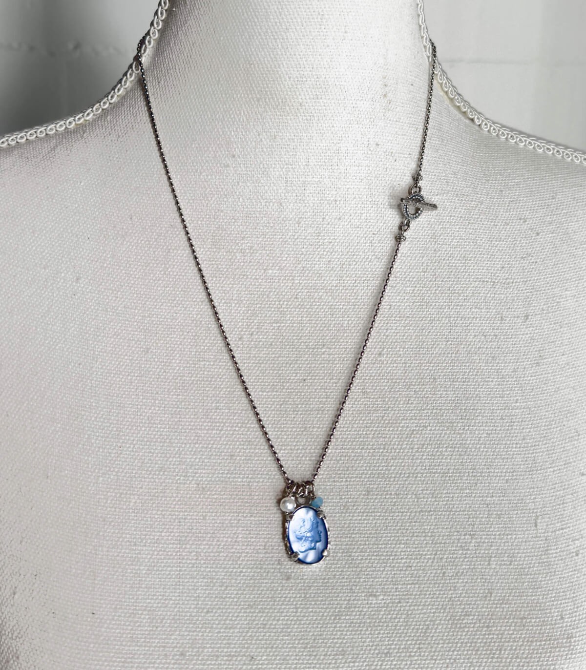 • Composition : argent massif, camée en verre vintage, perle blanche, perle de jade bleu