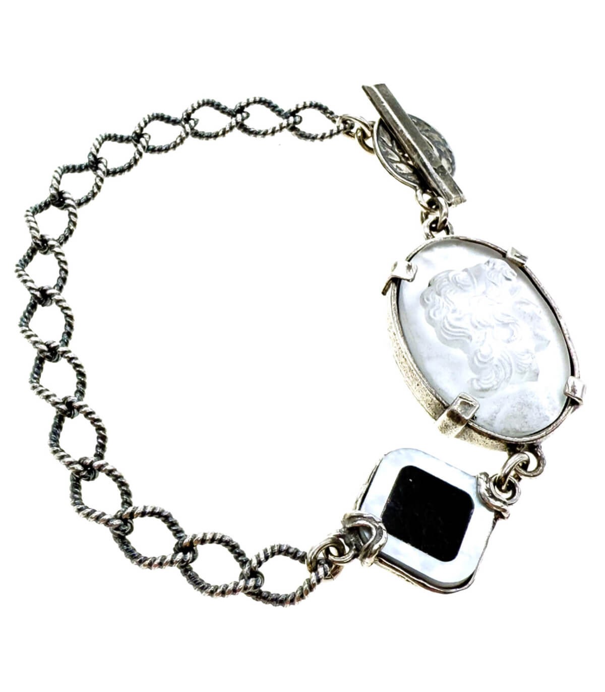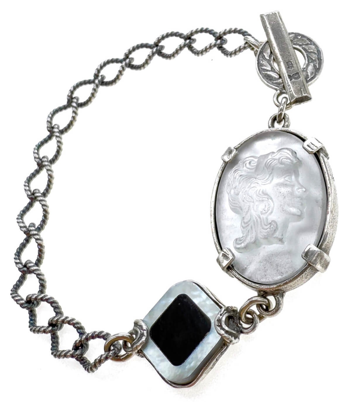 • Composition : argent massif, onyx incrusté de nacre, camée en verre vintage