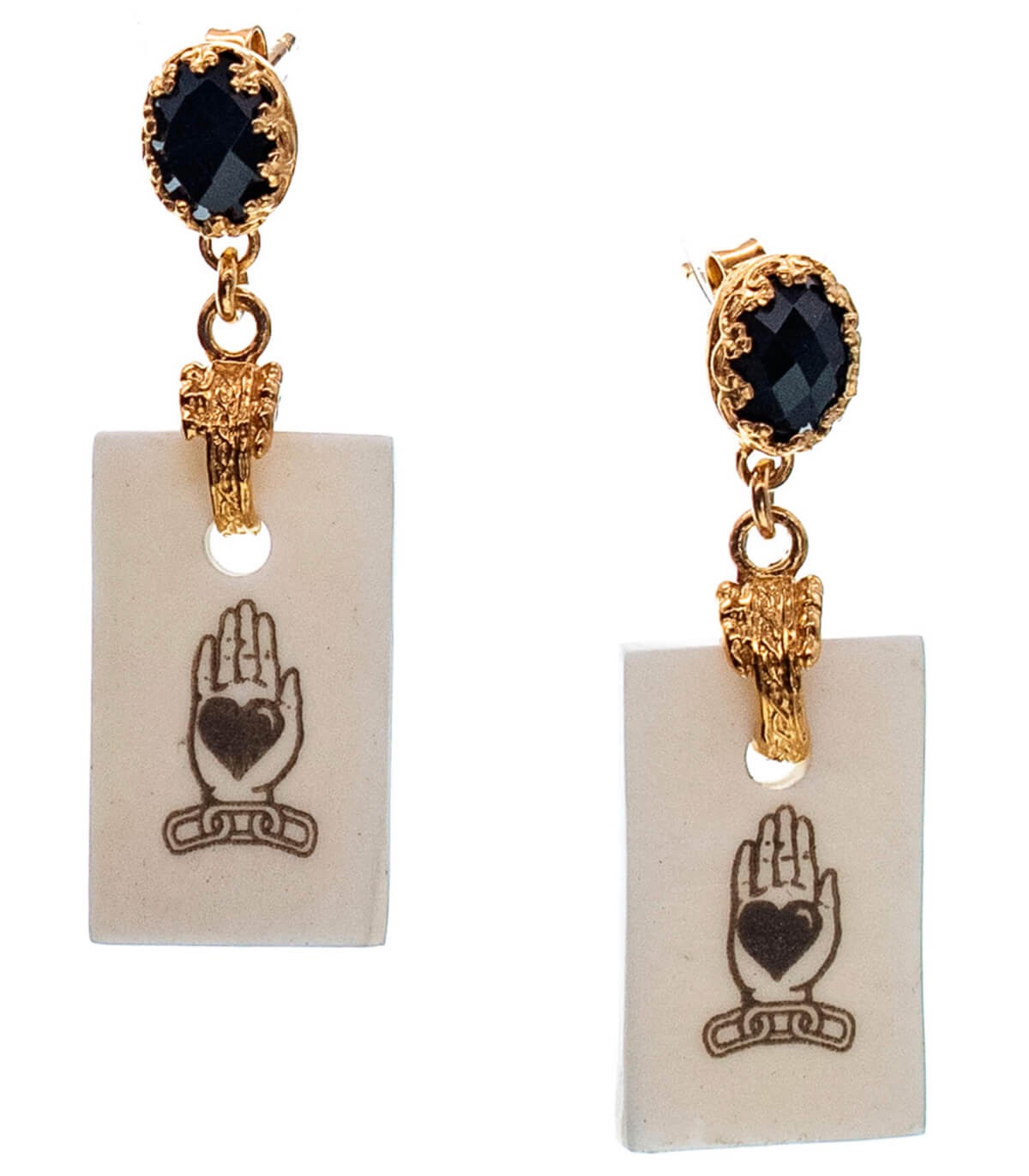 Information : boucles d'oreilles plaquées or avec corne gravée et spinelle