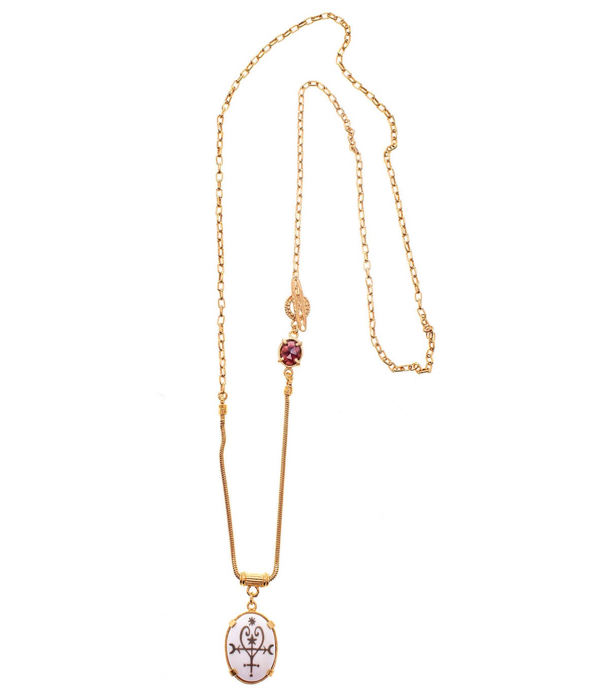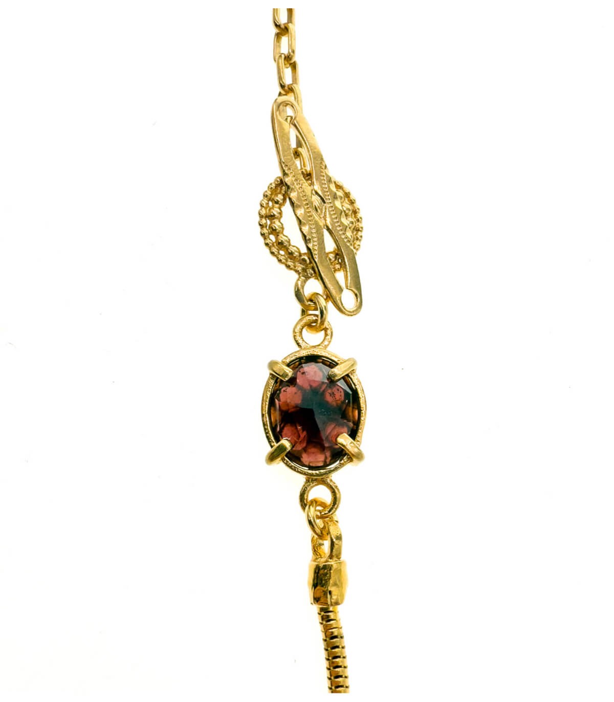 素材 : 18Kゴールドメッキブラスに彫刻入りボーンとカットガーネットをあしらったデザイン