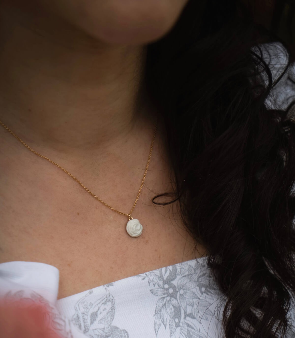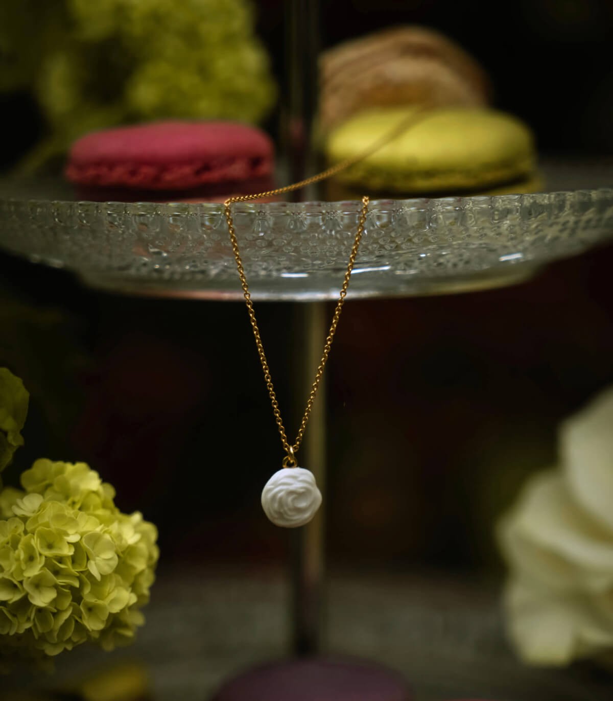 • 情報 : このローズネックレスはまさに定番アイテムです。真鍮製チェーンにファインゴールドプレート加工を施し、エナメル仕上げの磁器ペンダントがあしらわれています。このジュエリーはすべてフランスでハンドメイドされています