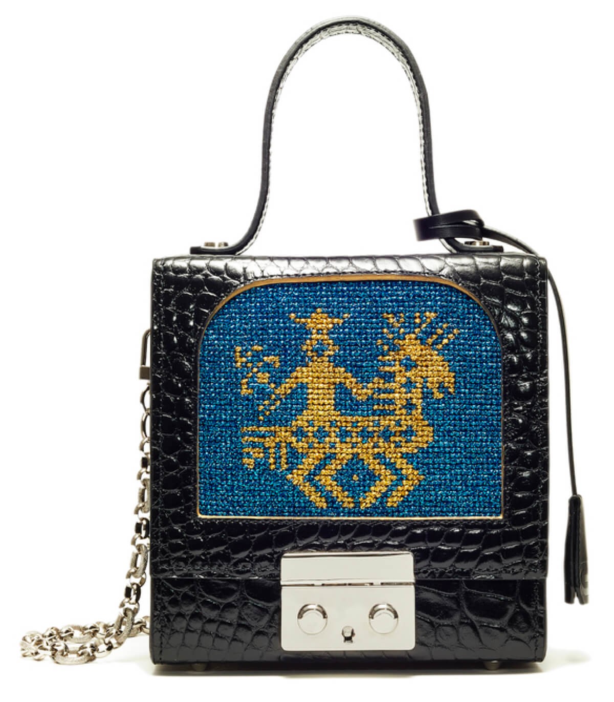 情報 : フルグレインカーフスキンを使用したハンドバッグ。ハンドエンボス加工のクロコダイルカーフスキンとボックスカーフスキンの2種類。メタリック糸で手刺繍を施し、ブルーの背景にゴールドの動物モチーフをあしらっています。フラップフレームの内側の縁は、ネットで滑らかに仕上げ、ゴールドに染め上げています。留め具と金具は真鍮とザマック製で、パラジウムコーティングが施されています。取り外し可能で長さ調節可能なボックスカーフカーフスキンのショルダーストラップ、または取り外し可能(長さ調節不可)のパラジウムコーティング真鍮製チェーンストラップからお選びいただけます。どちらのオプションもご用意しておりますが、価格はそれぞれ異なります。縁はブラックに染められています