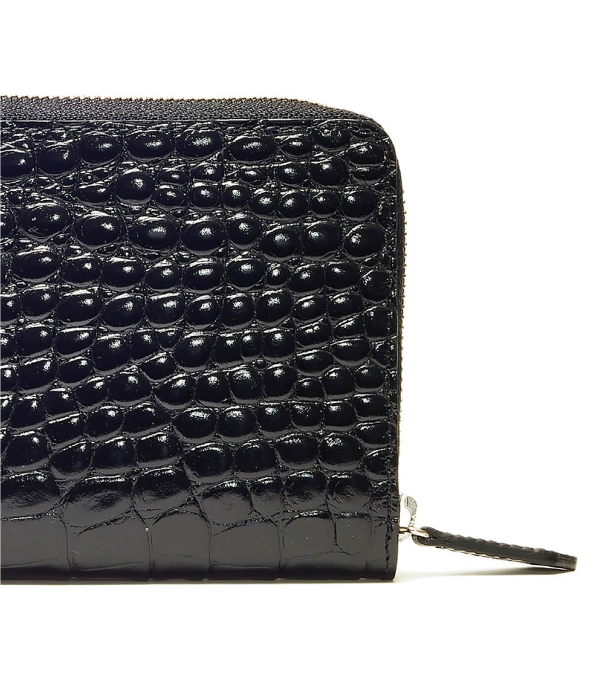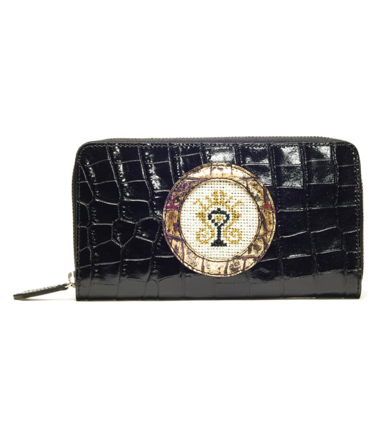 情報 : 「コンパニオン」スタイルのウォレット。クロコダイル柄をブラックで手作業でエンボス加工したフルグレインカーフスキンレザーを使用。クラウンモチーフをメタリック糸で手刺繍で表現しています。フレームもクロコダイル柄を手作業でエンボス加工したフルグレインカーフスキンレザーで、ブランド独自の芸術的技法(着色、酸化、メタライズ、ワックス加工による手作業による芸術的効果の付与)を用いて装飾されています。内側の縁は金色に染められています。写真はイメージです。革はそれぞれが異なり、一点一点が唯一無二の逸品です
