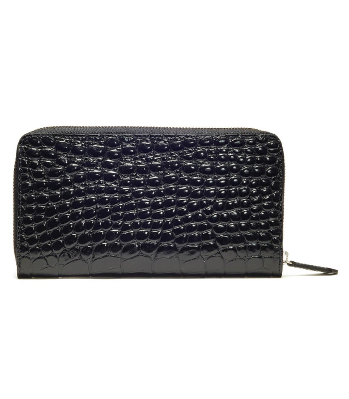 外側:フルグレインカーフスキン100%。手作業でクロコダイル柄をエンボス加工した硬質レザー。ブランドが独自に開発した、芸術的で職人技が光る本格的な技法を用いて装飾され、紫外線や摩耗に強い加工が施されています。ブラックの硬質レザーに手作業でクロコダイル柄をエンボス加工。YKKメタルジッパー。ラウンド型のメタリック糸で手刺繍されたディテール